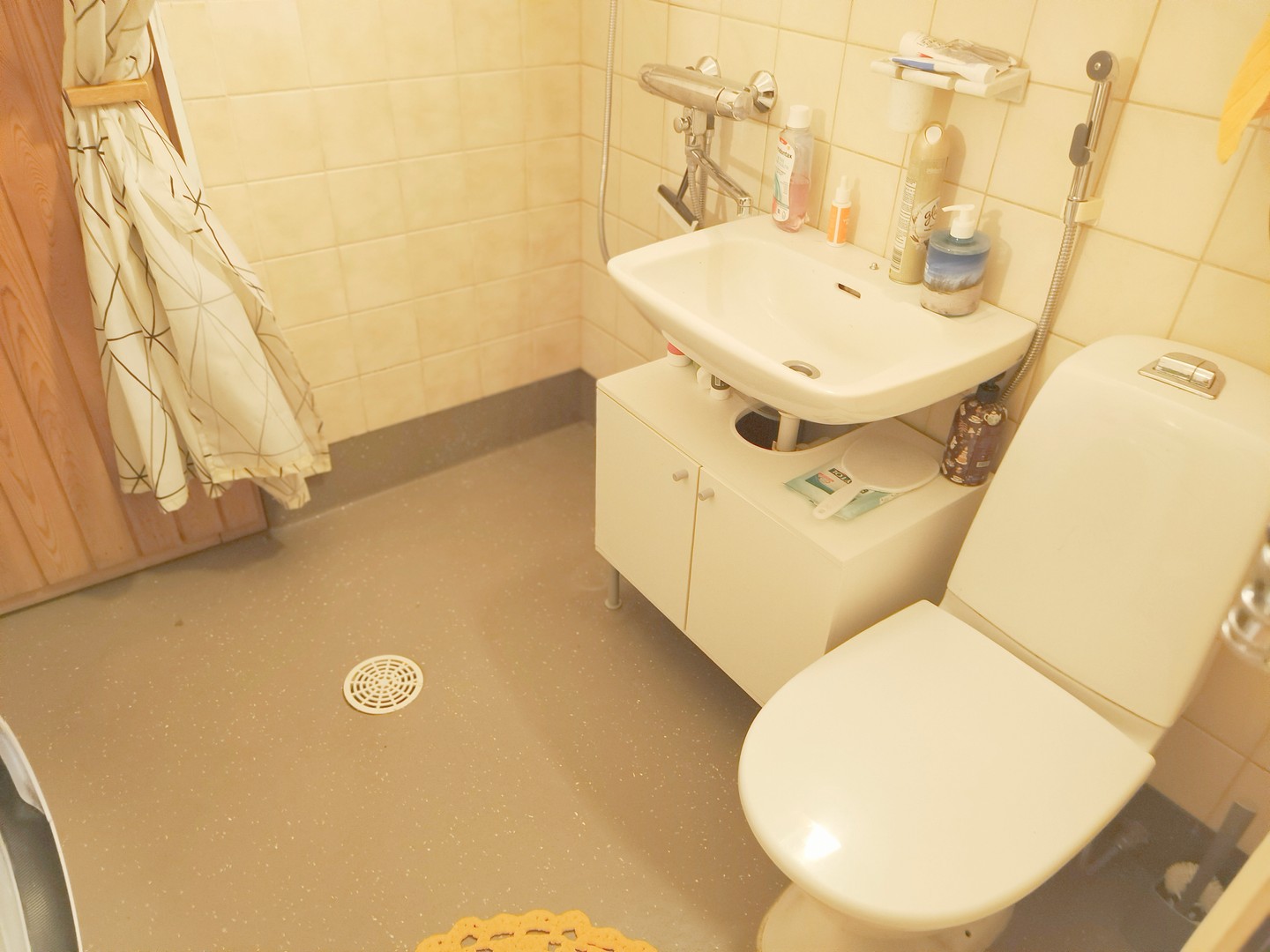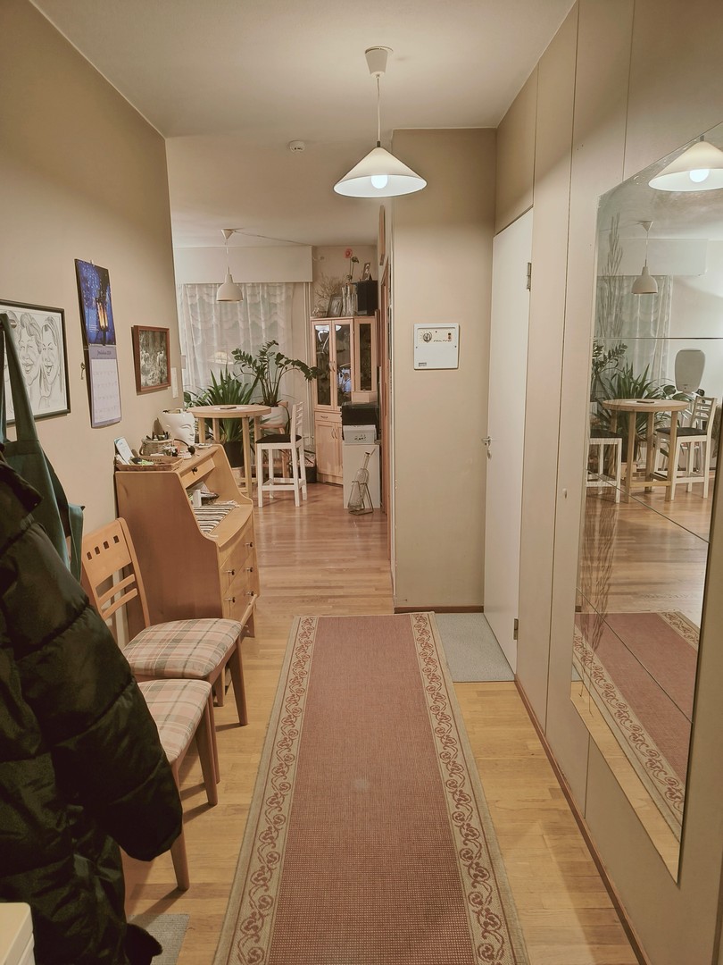 Tämä ensimmäisen kerroksen huoneisto on suunniteltu viihtyisyyttä silmällä pitäen. Olohuoneen parkettilattia ja seinien vaaleat sävyt luovat avaran ja kutsuvan tunnelman, joka toivottaa tervetulleeksi heti sisään astuessa. Suuret ikkunat päästävät runsaasti luonnonvaloa sisään, tehden asunnosta erityisen valoisan.