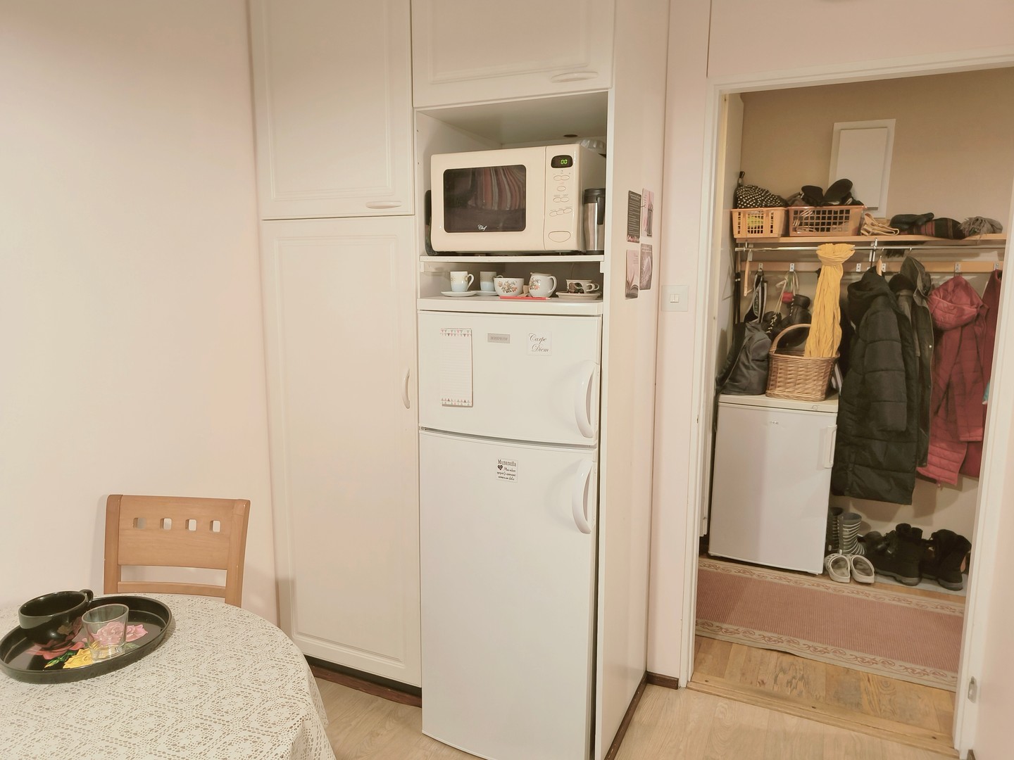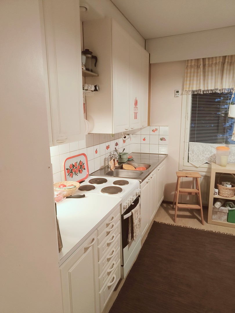 Keittiössä on kaikki tarvittava päivittäiseen elämään, mukaan lukien sähköliesi ja jääkaappi/pakastinkaappi. Työtilat ja kaapistot tarjoavat runsaasti säilytystilaa. Makuuhuoneessa on myös parkettilattia ja rauhalliset värit, jotka takaavat rauhalliset yöunet.