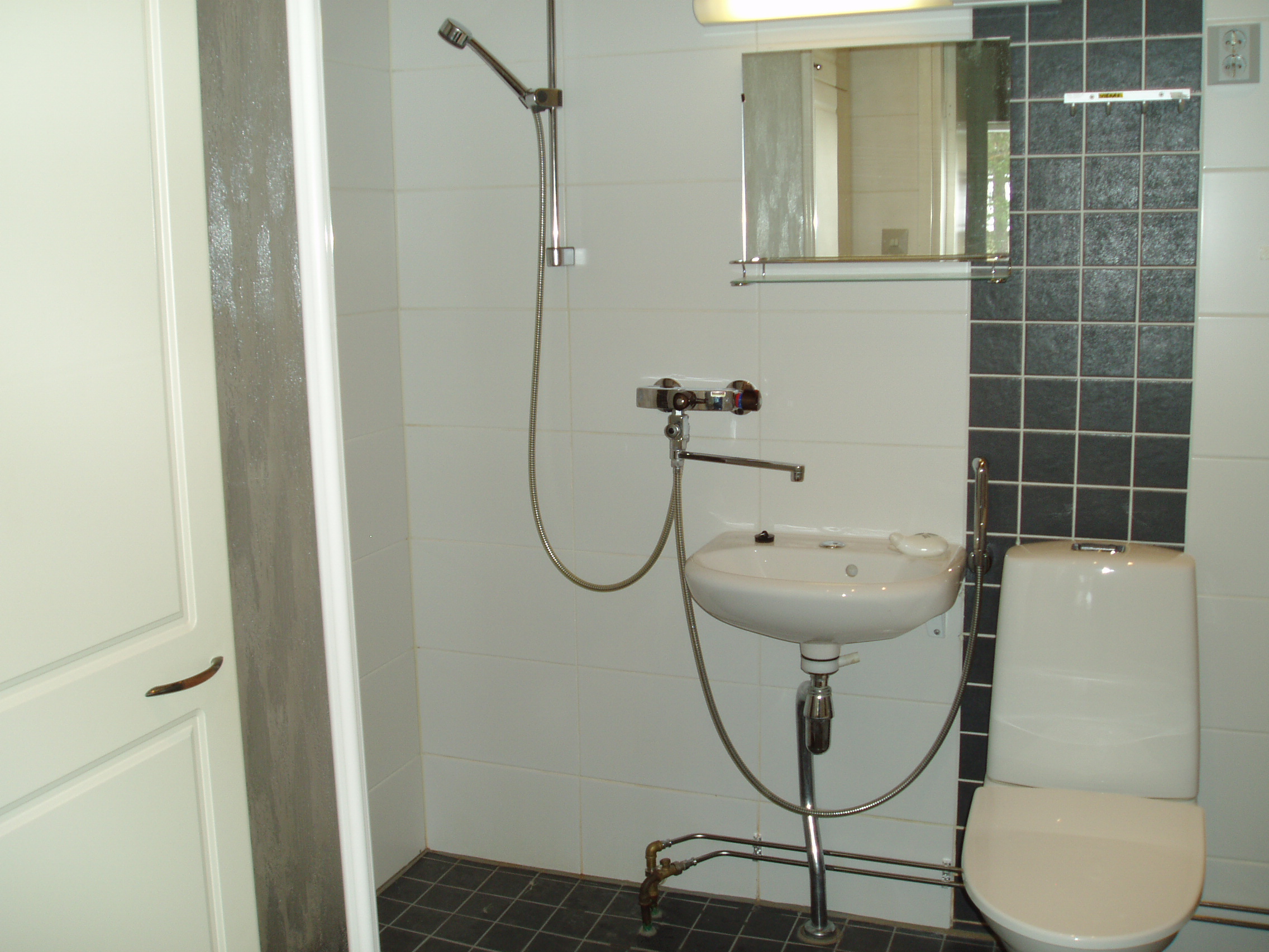 WC-istuin, suihku, pesuallas ja pesukoneliitäntä -Suihku, wc, käsienpesuallas, pk-liitäntä -Seinät ja lattia laatoitettu