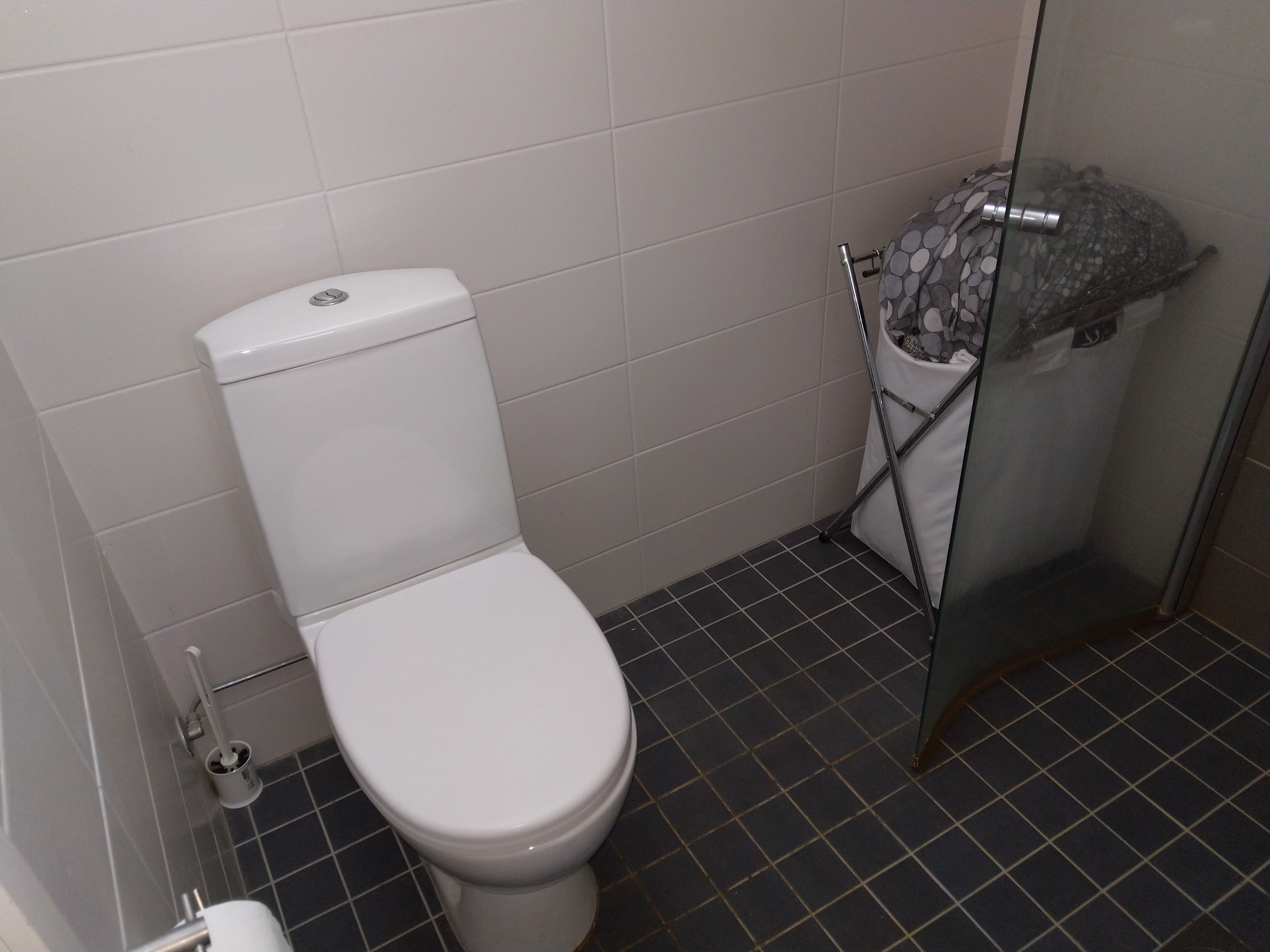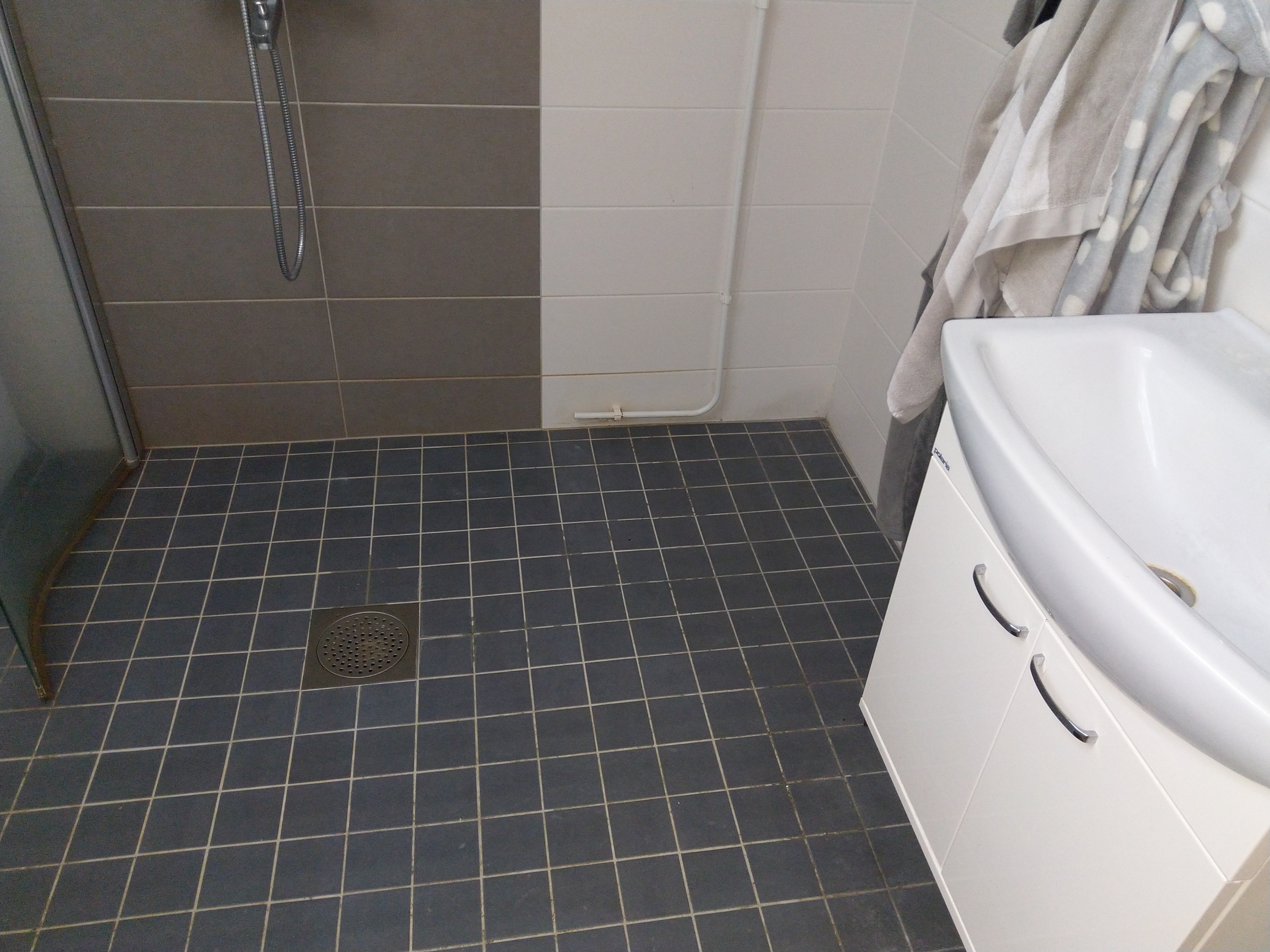 WC-istuin, suihku, suihkuseinä, pesuallas ja pesukoneliitäntä -Suihku, suihkuseinä, wc, käsienpesuallas, pk-liitäntä -Seinät ja lattia laatoitettu (lattialämmitys)