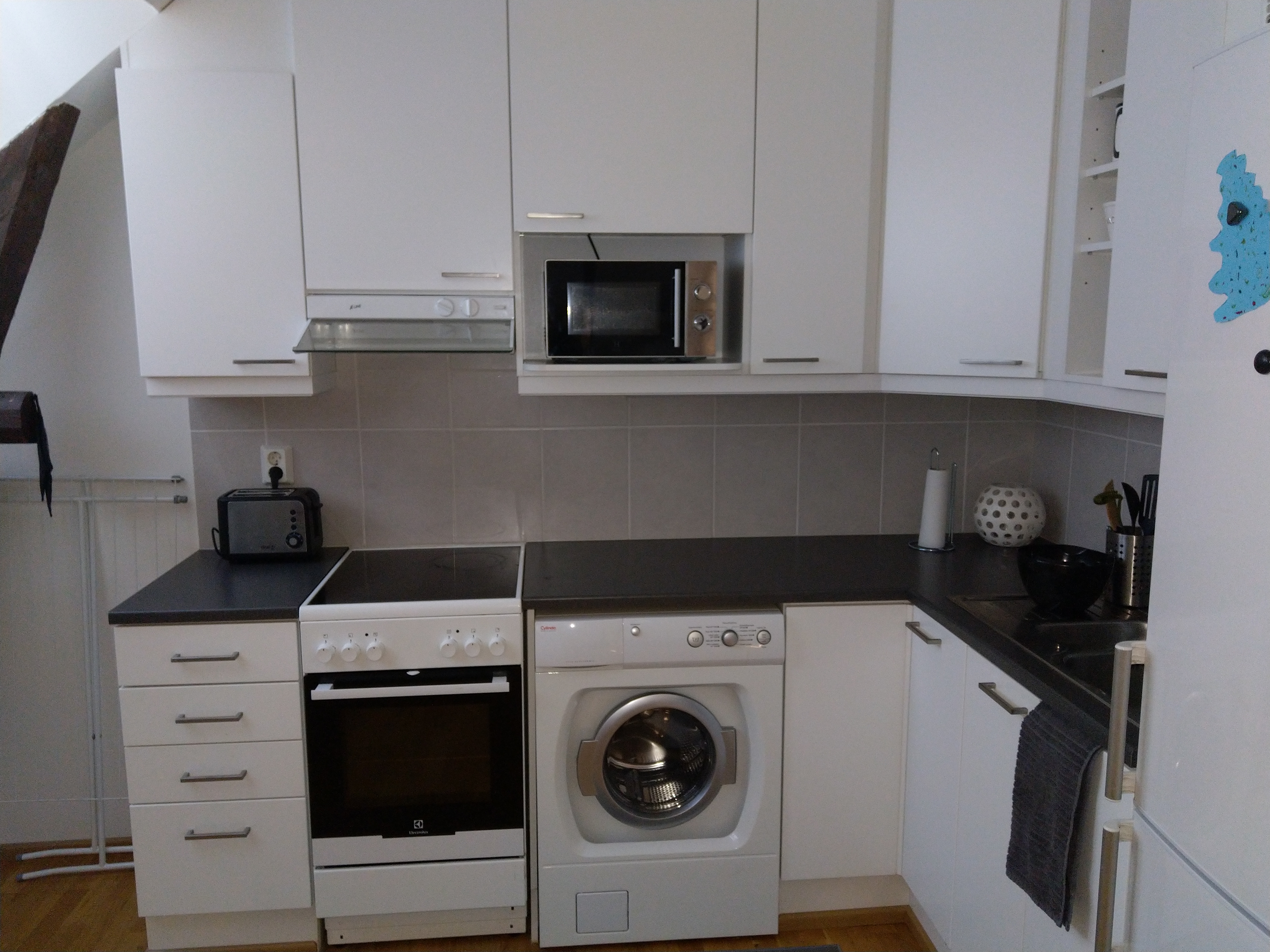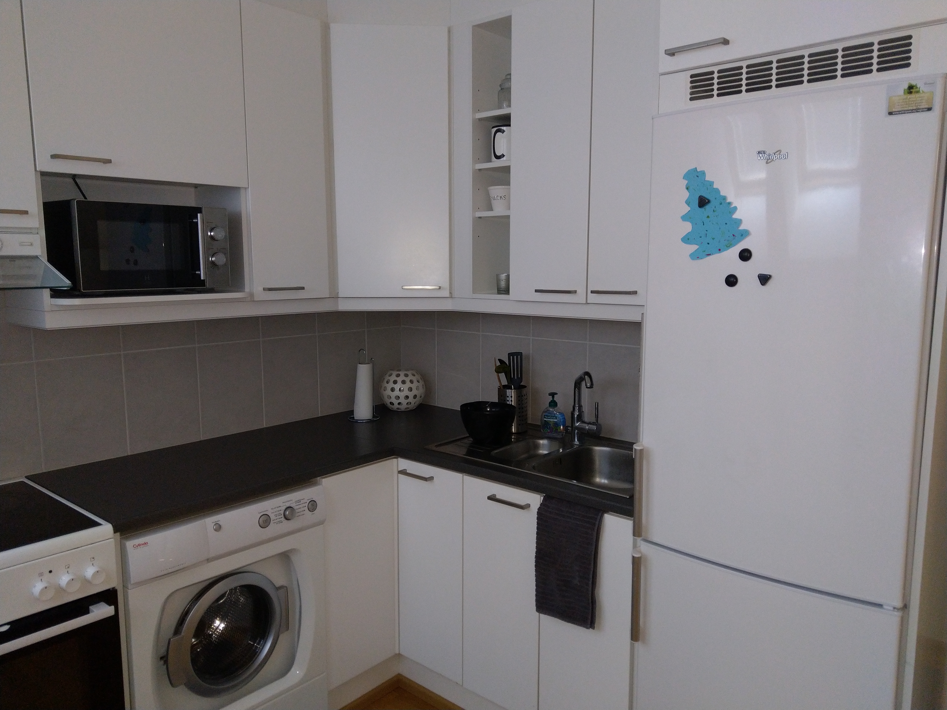 Jääkaappipakastin, liesi ja liesituuletin. Liesi: Keraaminen liesi. Työtason materiaali: Parketti. -Keraaminen liesi, liesituuletin, jääkaappi/pakastinkaappi, astianpesune -Työpöytä, tiskipöytä, kaapistot