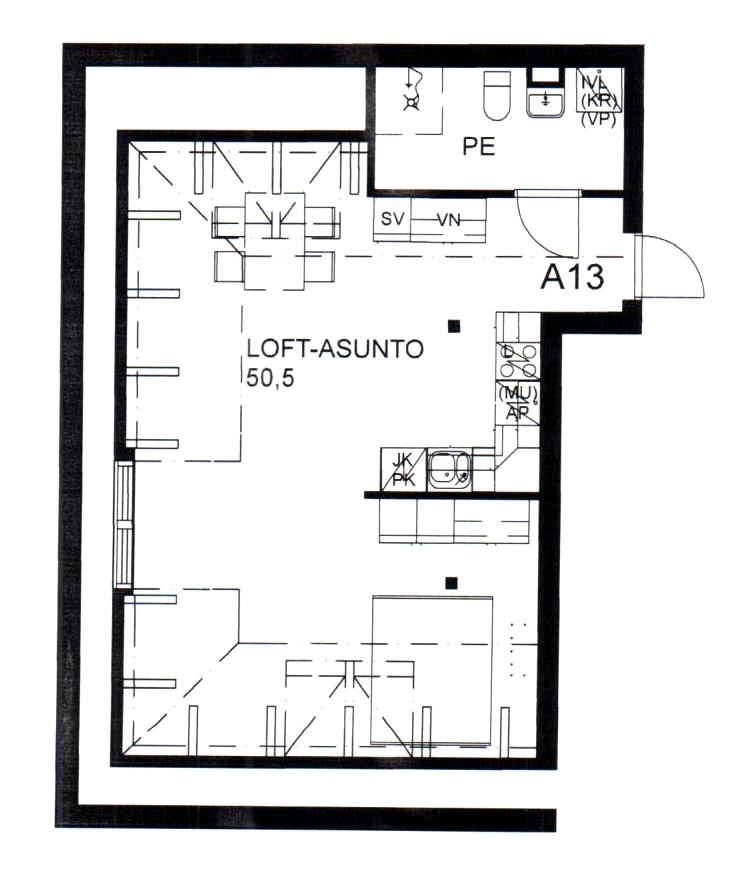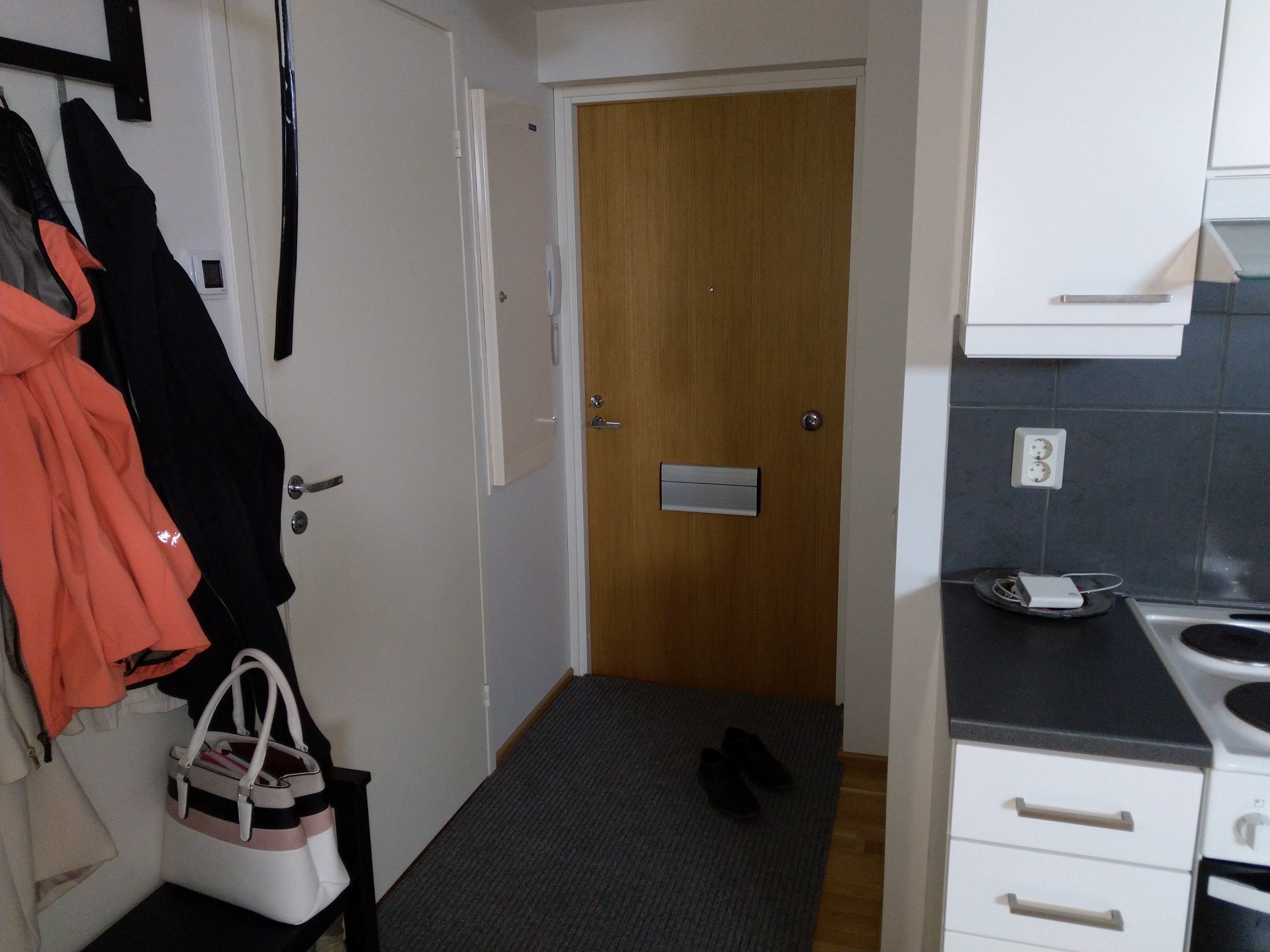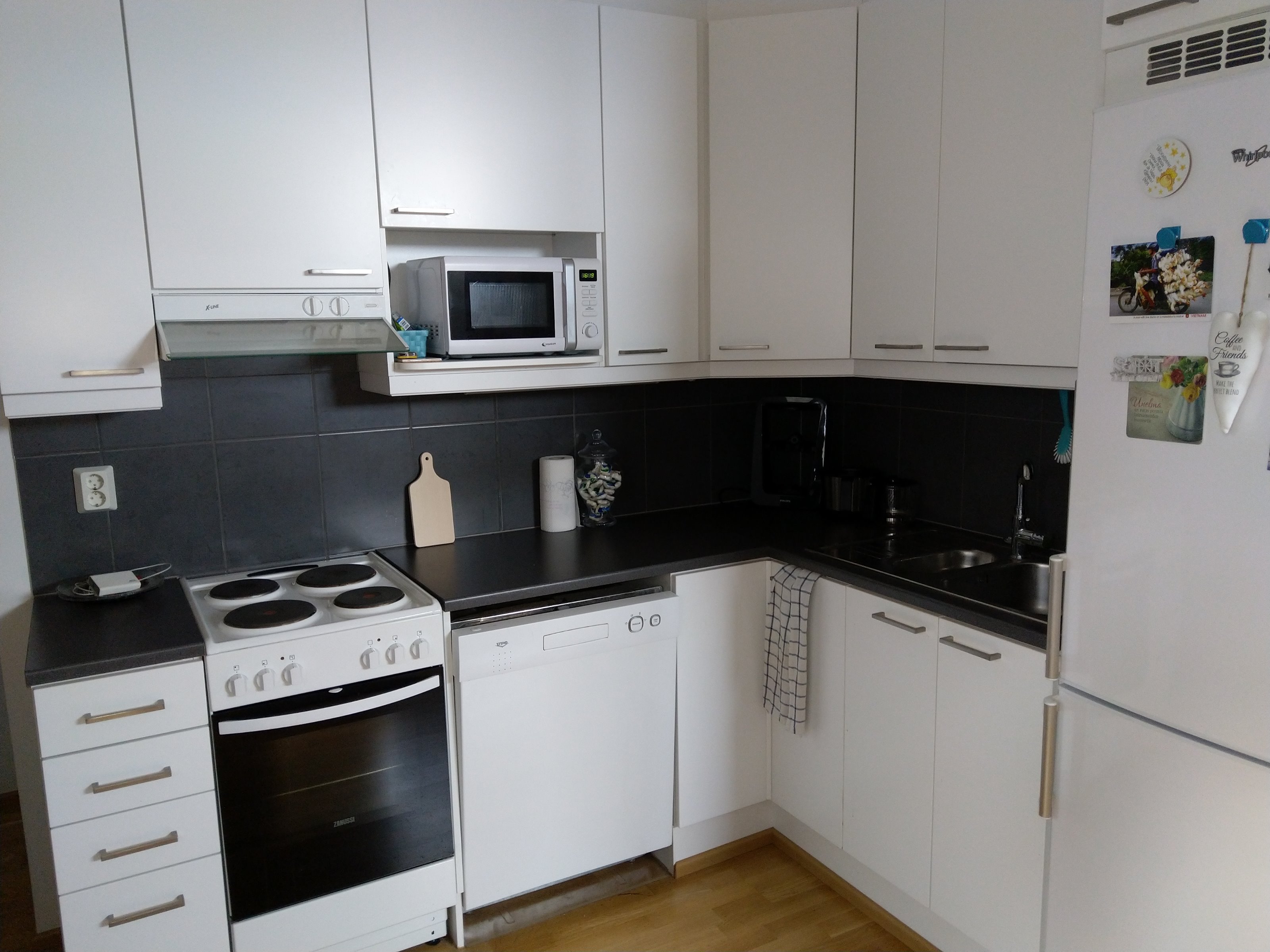 Liesi, uuni, liesituuletin, jääkaappipakastin ja astianpesukone. Liesi: Keraaminen liesi. Työtason materiaali: Parketti. -Keraaminen liesi, liesituuletin, jääkaappi/pakastinkaappi, astianpesukone -Työpöytä, tiskipöytä, kaapistot -Parkettilattia