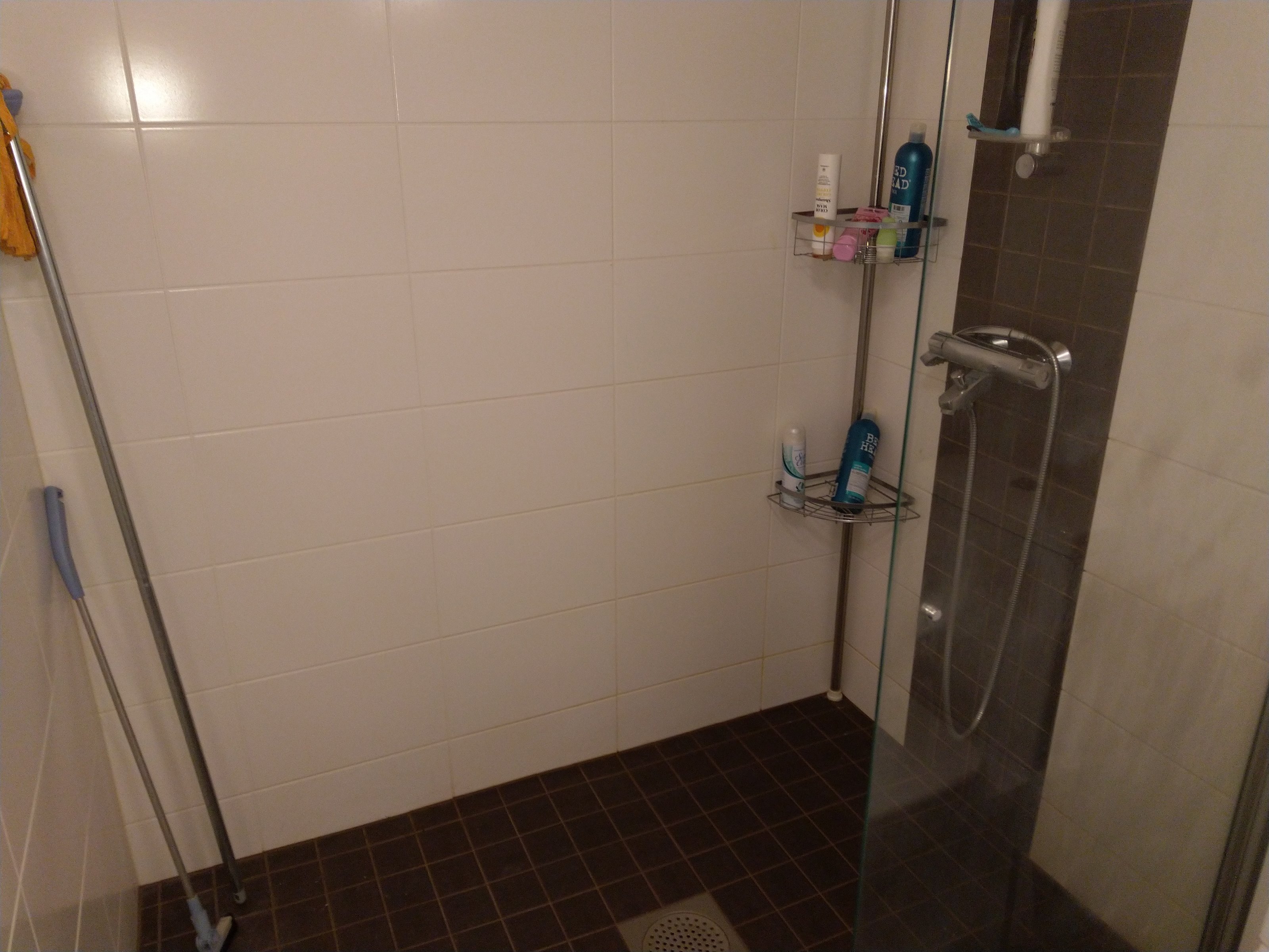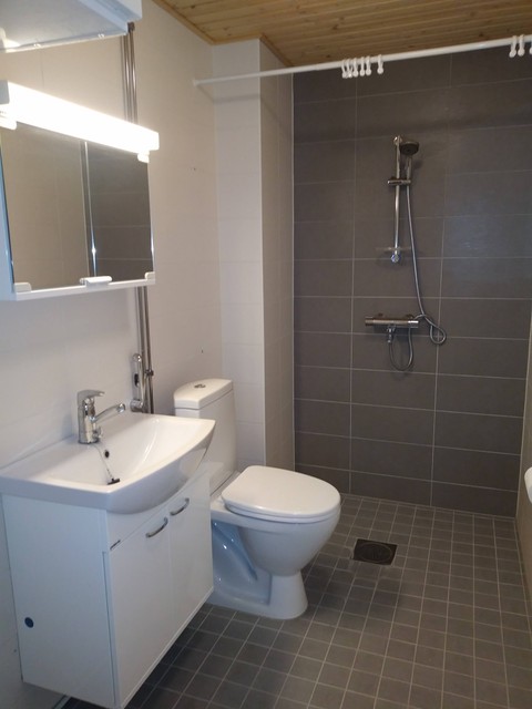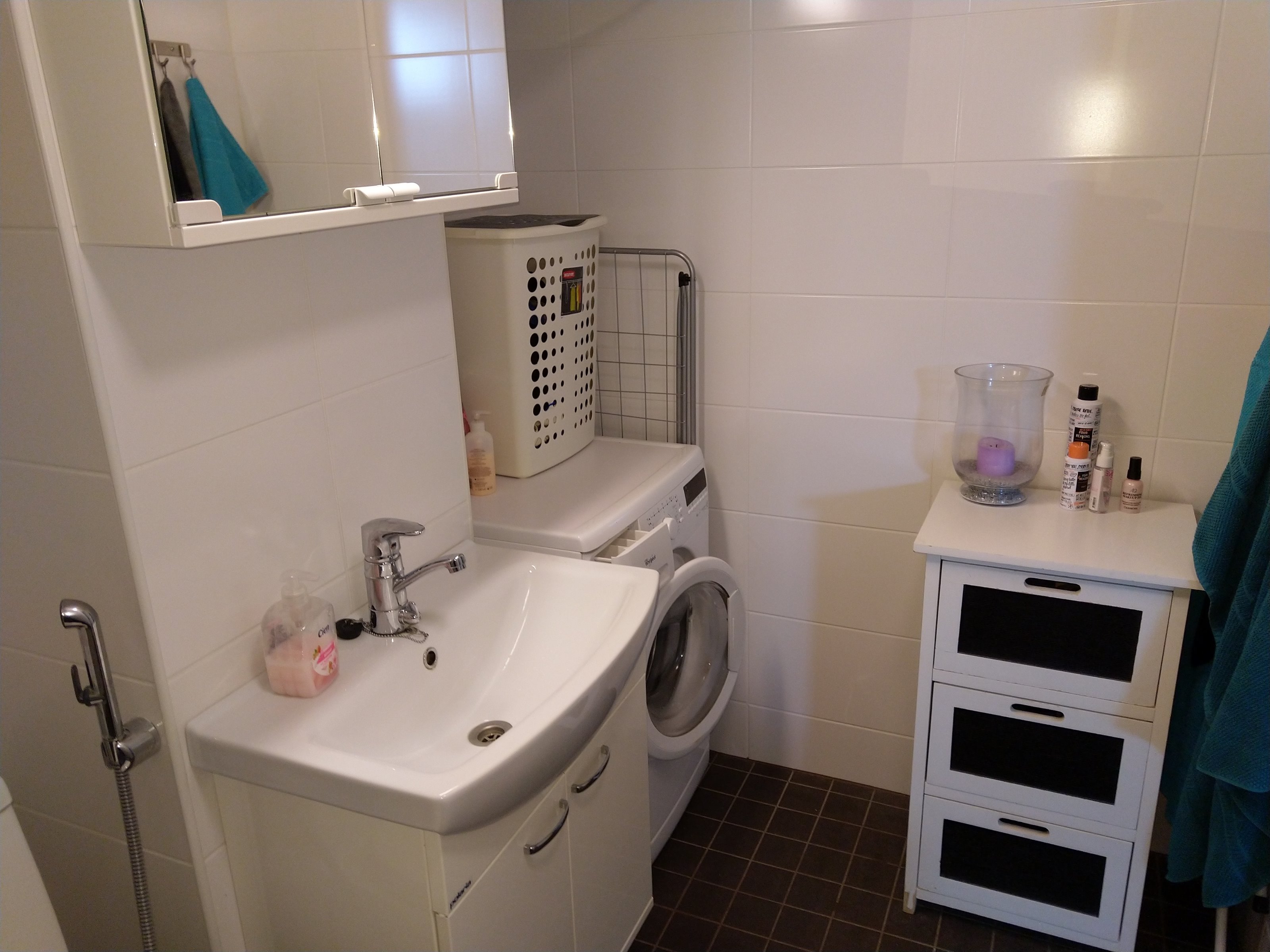 WC-istuin, suihku, suihkuseinä, pesukoneliitäntä ja pesuallas -Suihku, suihkuseinä, wc, käsienpesuallas, pk-liitäntä -Seinät ja lattia laatoitettu (lattialämmitys)
