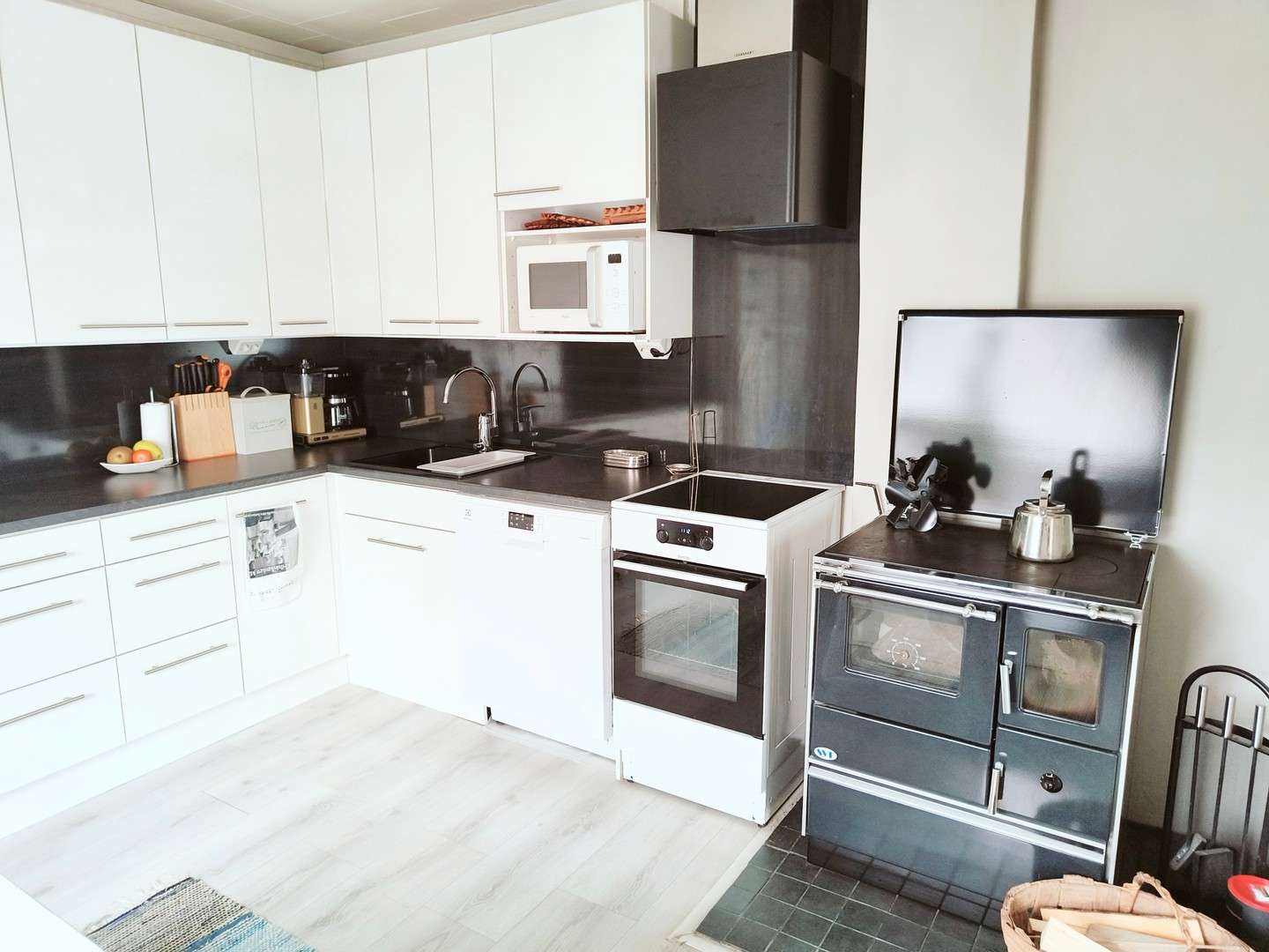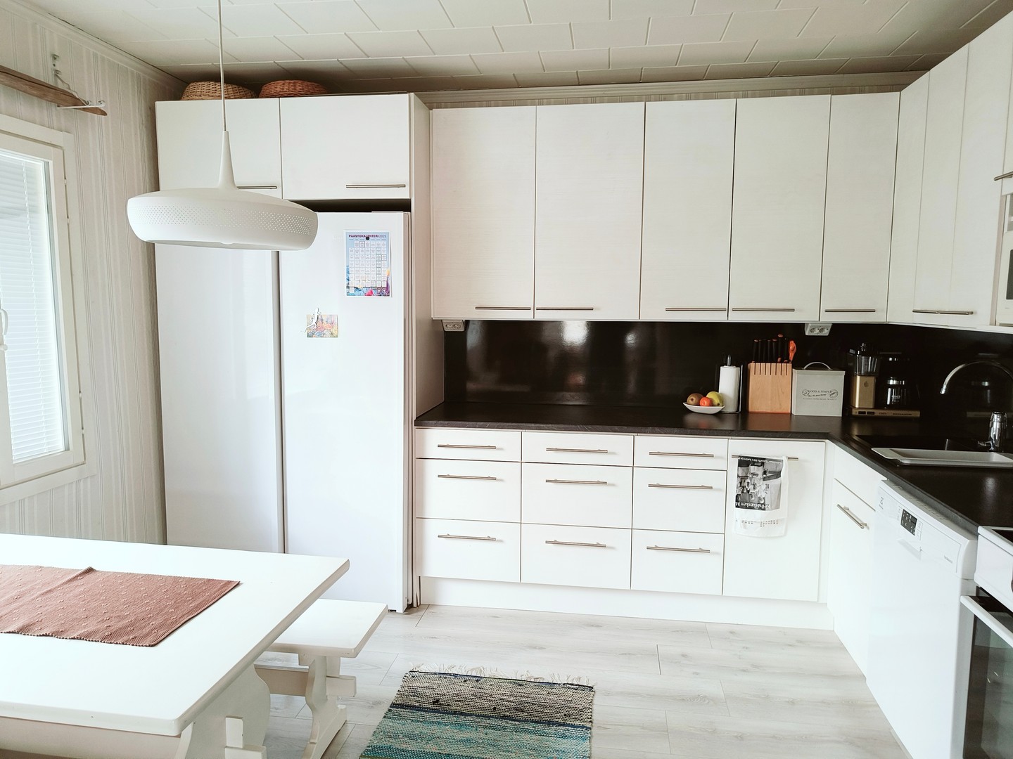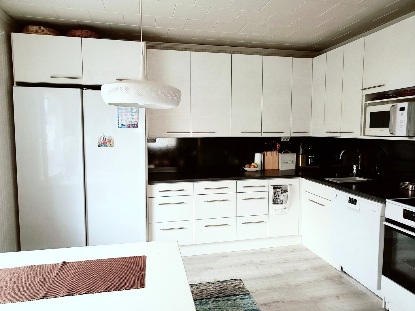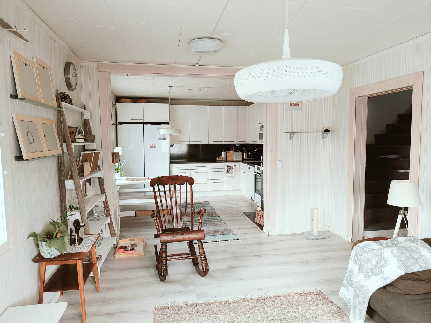 Sisään astuessa vastaan ottaa kodikas tunnelma, jota korostavat laminaattilattiat ja kauniit seinäpinnat. Tilava olohuone on täydellinen paikka rentoutua perheen ja ystävien kanssa. Keittiö on varusteltu nykyaikaisilla laitteilla, ja sieltä löytyy myös runsaasti säilytystilaa.