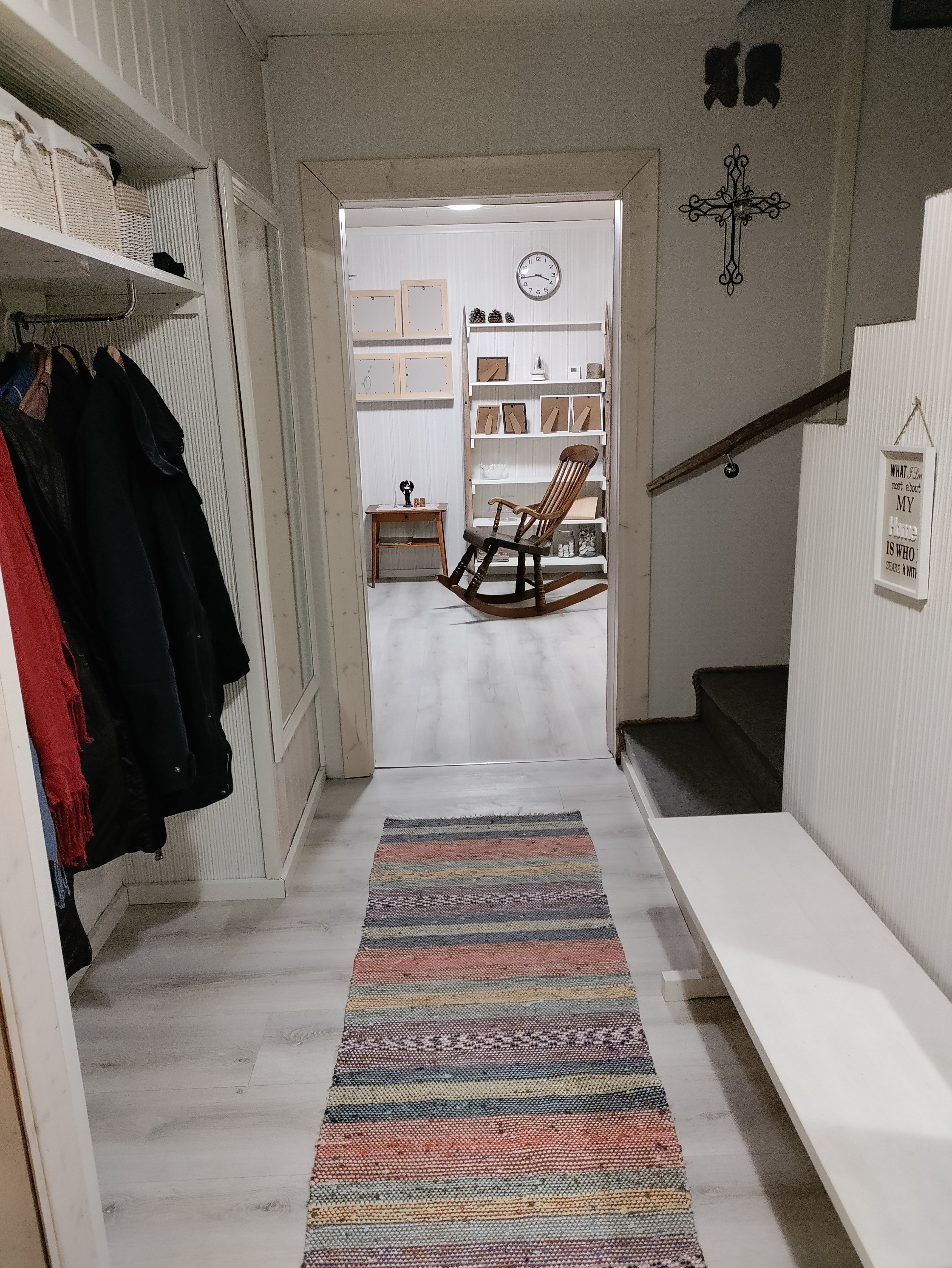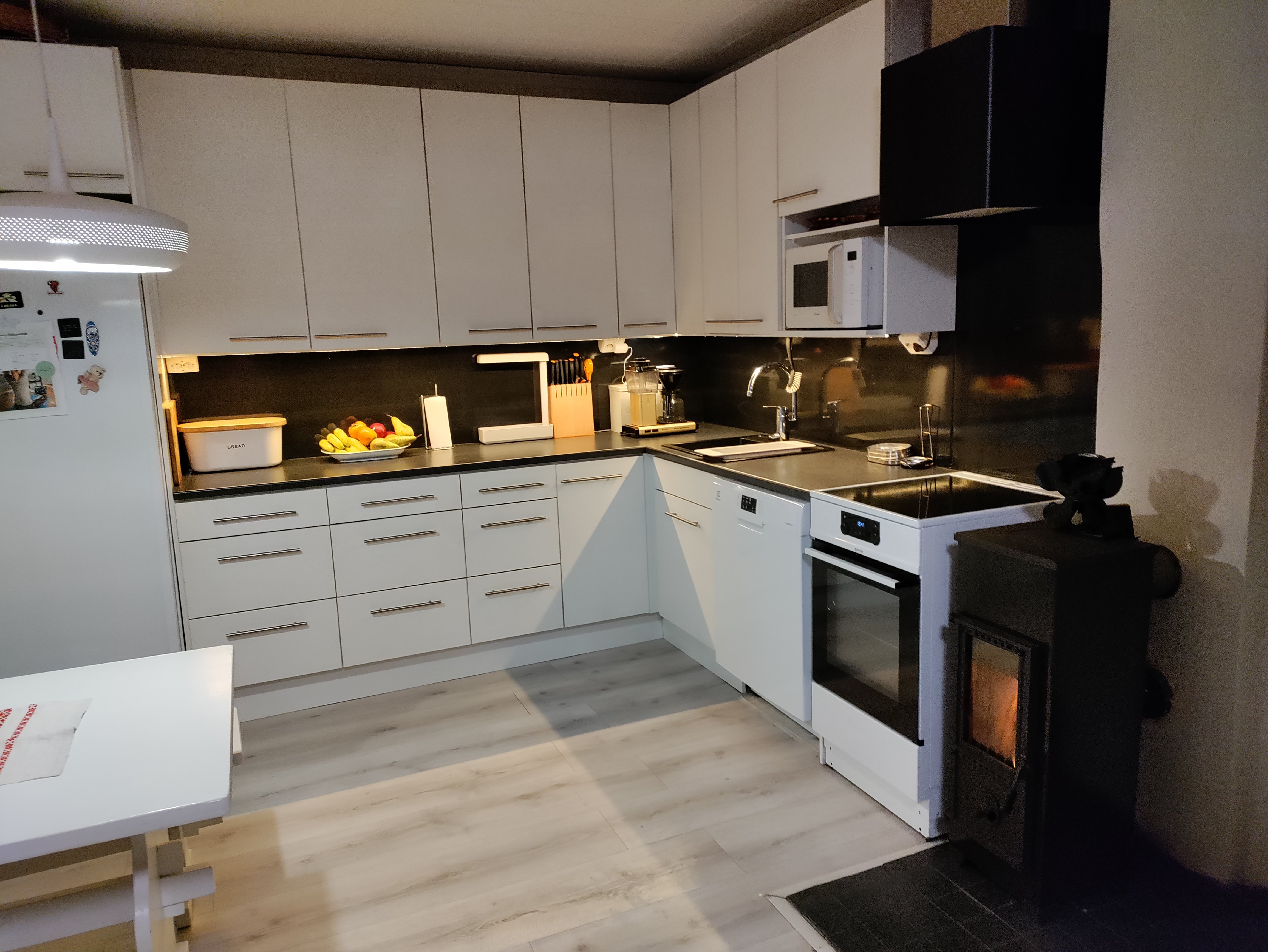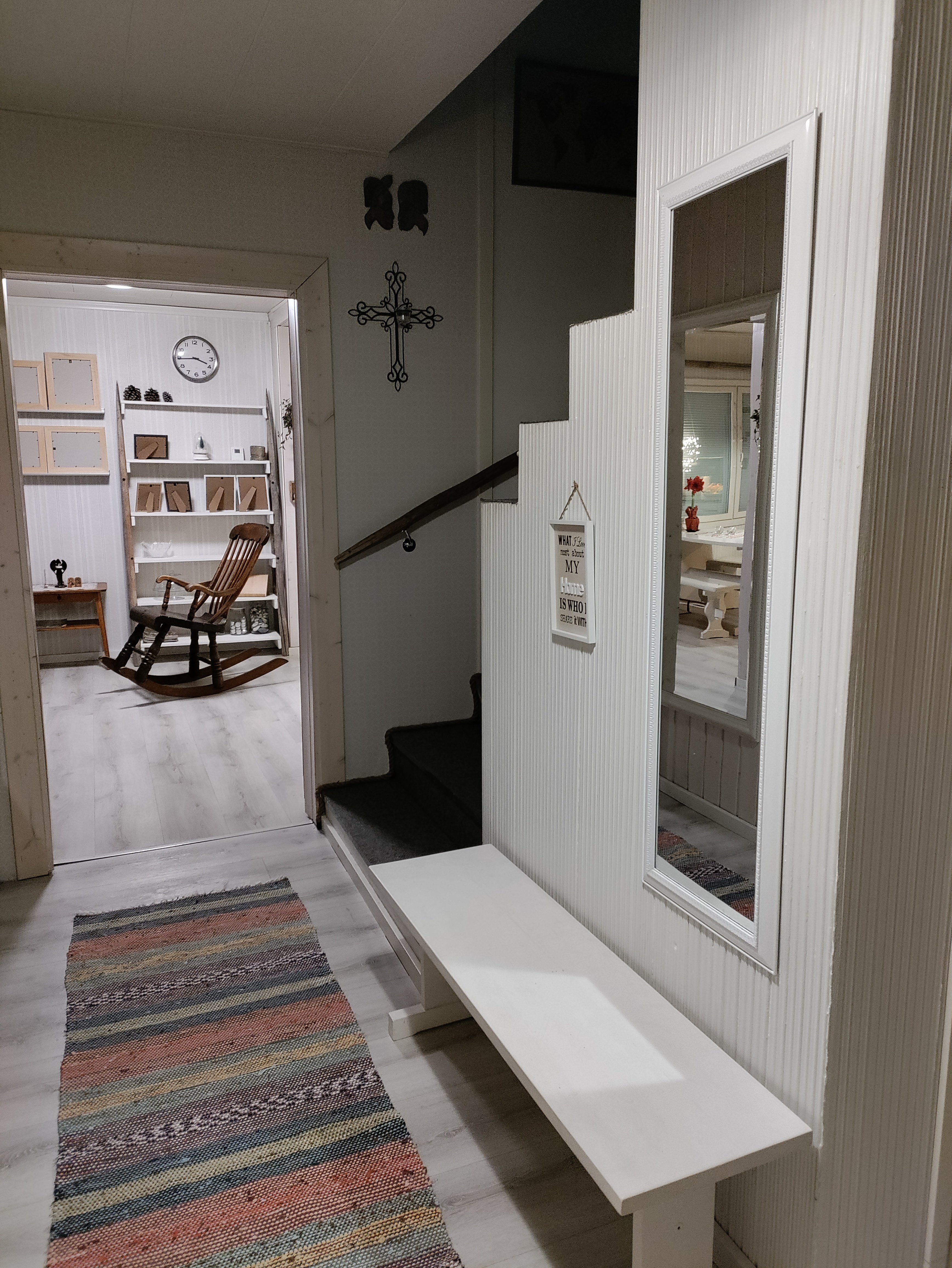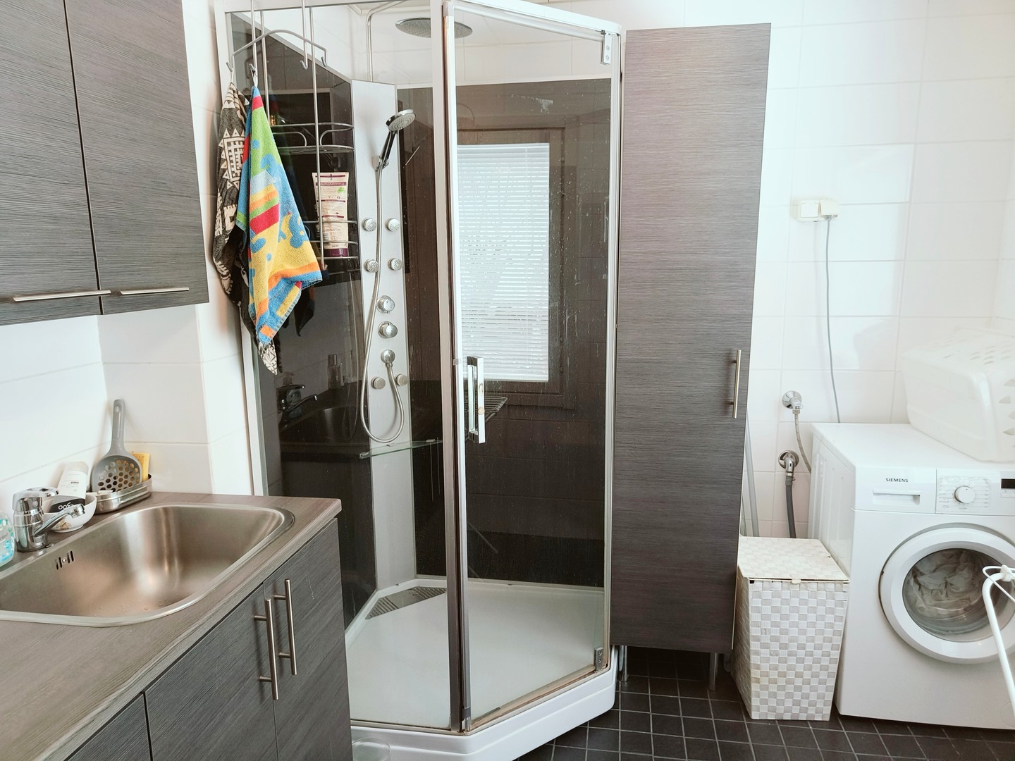 Sisään astuessa vastaan ottaa kodikas tunnelma, jota korostavat laminaattilattiat ja kauniit seinäpinnat. Tilava olohuone on täydellinen paikka rentoutua perheen ja ystävien kanssa. Keittiö on varusteltu nykyaikaisilla laitteilla, ja sieltä löytyy myös runsaasti säilytystilaa.
