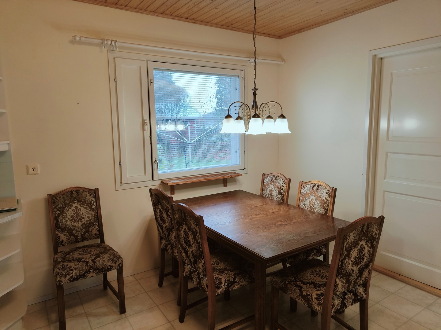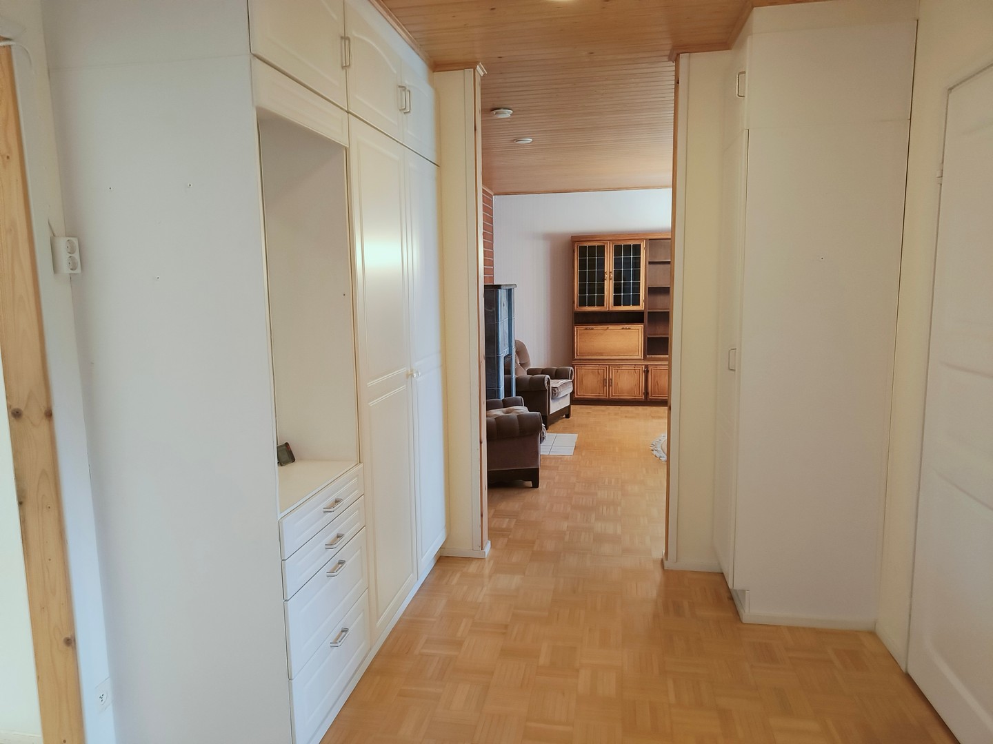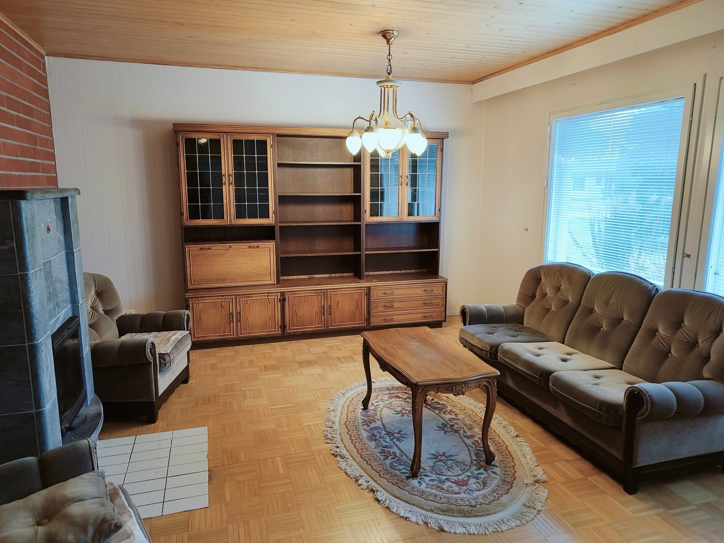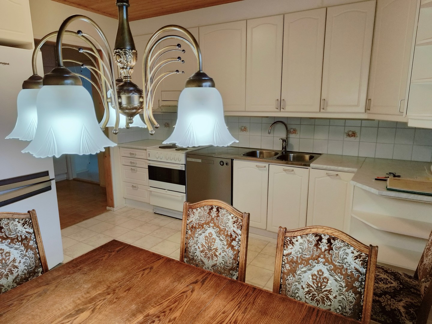 Olohuoneen mosaiikkiparkettilattia ja varaava vuolukivitakka luovat tilaan viihtyisän tunnelman, joka kutsuu perheen ja ystävät kokoontumaan yhteen. Keittiössä on kaikki tarvittavat kodinkoneet ja tilaa ruoanlaittoon, mikä tekee arjesta sujuvaa. Lisäksi talossa on oma sauna, jossa voit rentoutua pitkän päivän jälkeen.