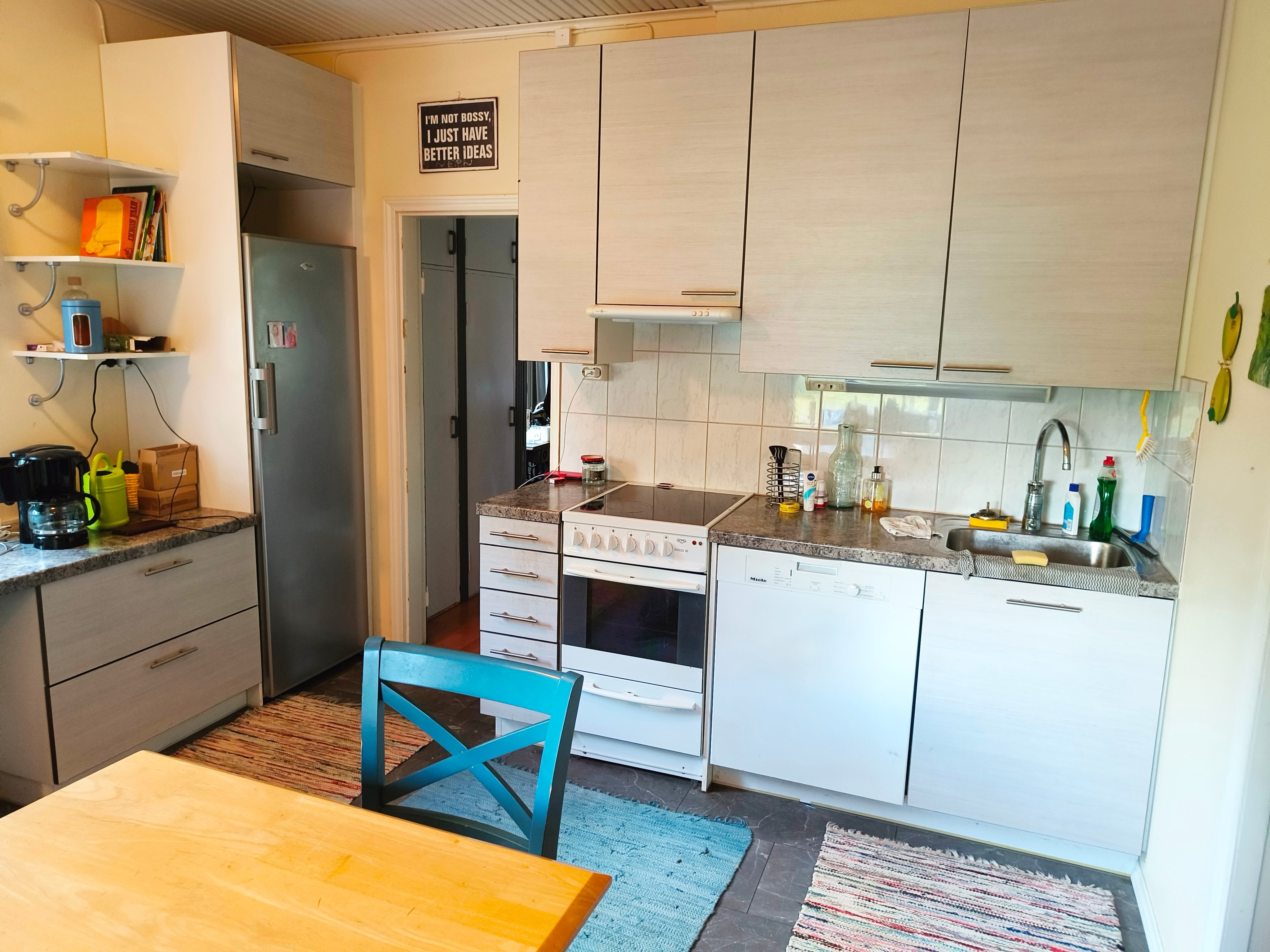 Kahdessa kerroksessa oleva talo on hyväkuntoinen ja sen 120 neliön asuintilat ovat käytännölliset. Olohuoneen parkettilattia ja lämpöä varaava takka luovat viihtyisän ilmapiirin. Keittiössä on kaikki tarpeellinen, kuten keraaminen liesi ja astianpesukone, ja se on helppo pitää järjestyksessä kaapistojen ansiosta.