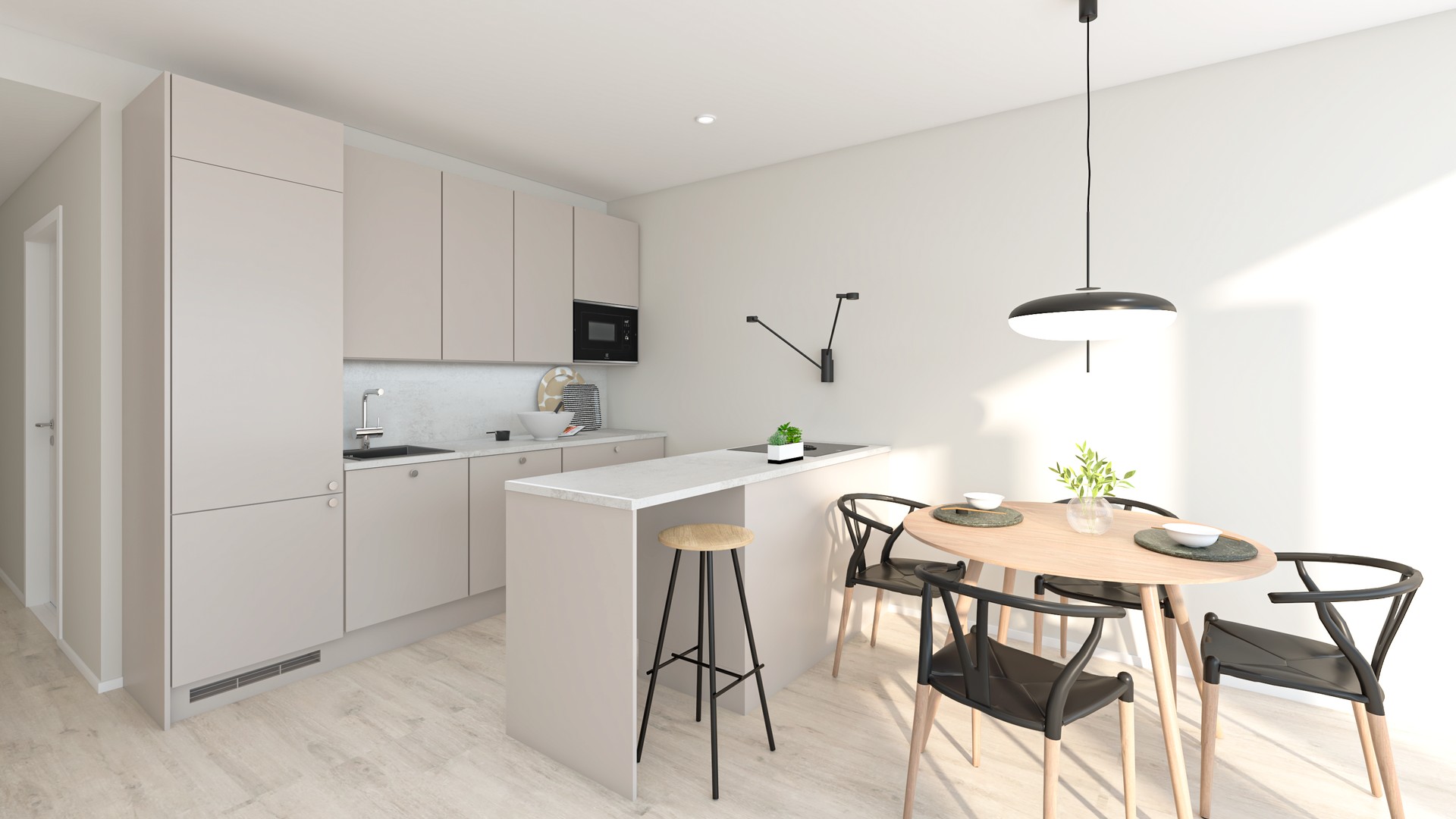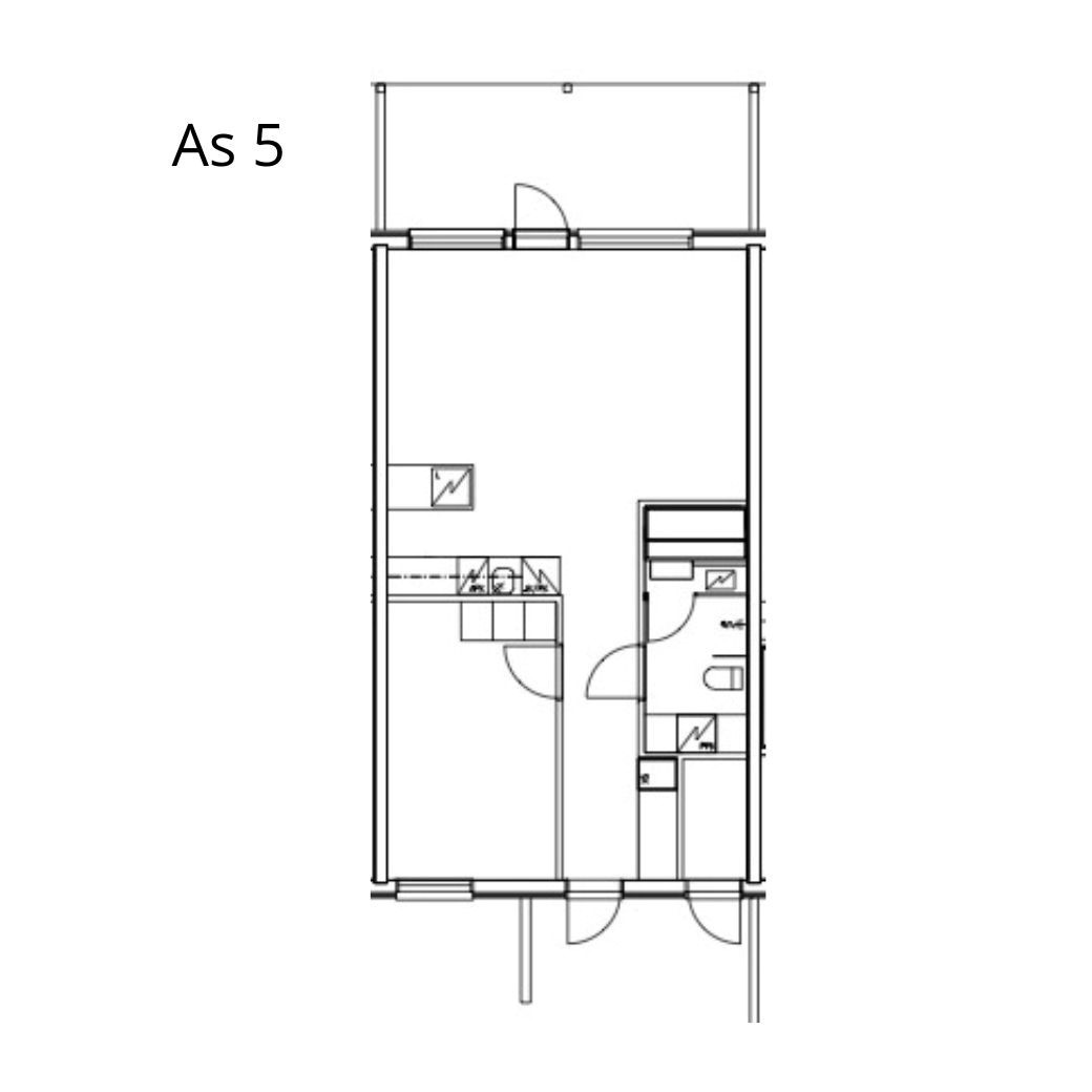 Jääkaappipakastin, liesi, erillisuuni ja astianpesukone. Liesi: Induktioliesi. Työtason materiaali: Laminaatti. -Induktioliesitaso, liesituuletin, erillisuuni, mikroaaltouuni, jääkaappi/pakastinkaappi, astianpesukone -Työpöytä, tiskipöytä, kaapistot -Laminaattilattia