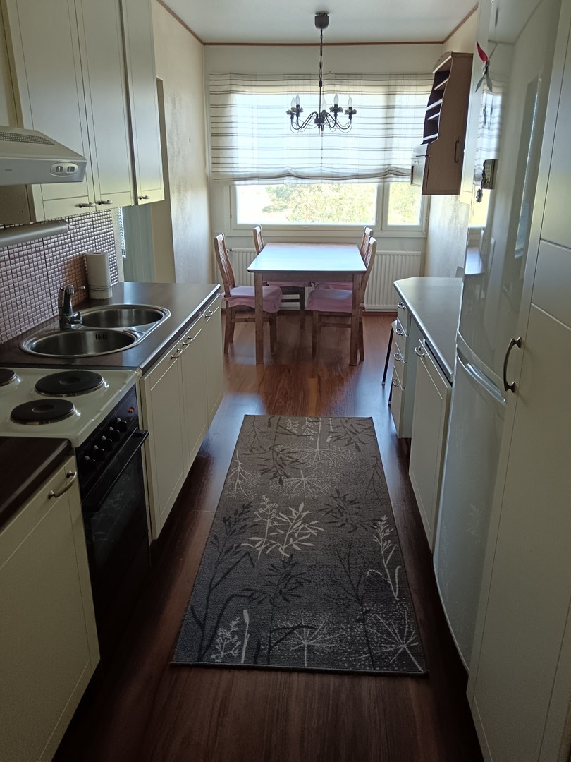 Asunnon laminaattilattiat ja valoisat seinäpinnat luovat kutsuvan tunnelman heti sisään astuessasi. Keittiö on varustettu kaikella tarvittavalla, kuten sähköliesi, jääkaappi/pakastinkaappi ja runsaasti kaappitilaa, joten kokkailu sujuu vaivattomasti. Kylpyhuoneessa on modernit mukavuudet, kuten suihku ja wc, sekä pesukoneliitäntä.